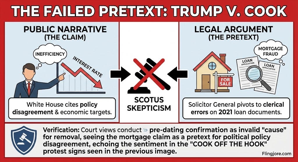 While the White House has publicly criticized Cook for “inefficiency” regarding interest rate policy, the Solicitor General’s arguments in court pivoted to a narrower, conduct-based claim: allegations of mortgage fraud pre-dating Cook’s appointment.