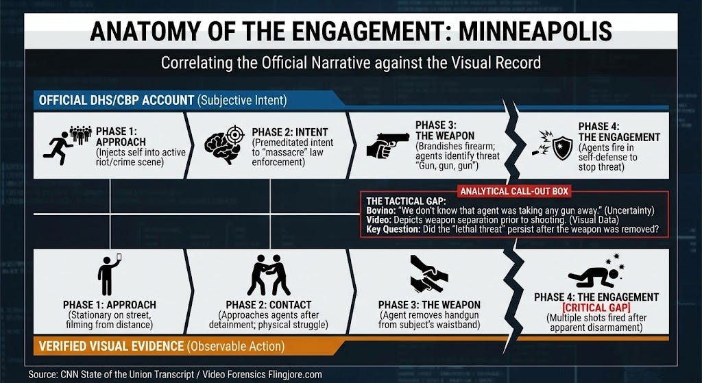The following graphic correlates the official Border Patrol narrative against the verified visual record, highlighting the moment the professional standard collapsed.