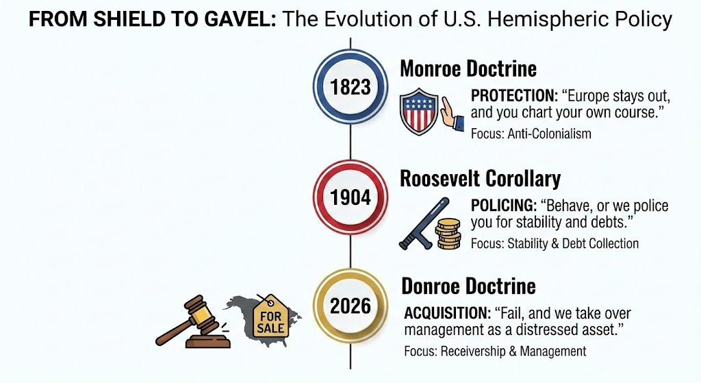 Historians often cite Theodore Roosevelt’s 1904 Corollary as the moment the U.S. became the hemisphere’s policeman, but TR’s “Big Stick” was largely about debt collection and stability. The “Donroe Doctrine” goes further. It is not just policing; it is receivership.