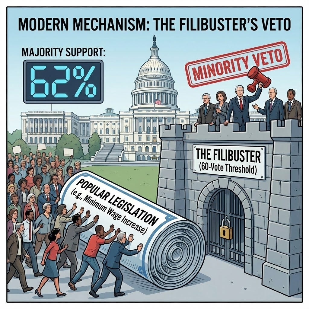 What the Founders called the "tyranny of the majority" — the fear that the masses would trample the rights of the few — has evolved into a modern "tyranny of the minority." Through a complex interlocking system of the Senate, the Electoral College, the filibuster, and the Supreme Court, the American political apparatus has been insulated from the very voters it claims to serve, effectively locking down the economic interests of the establishment against the volatile will of the people.