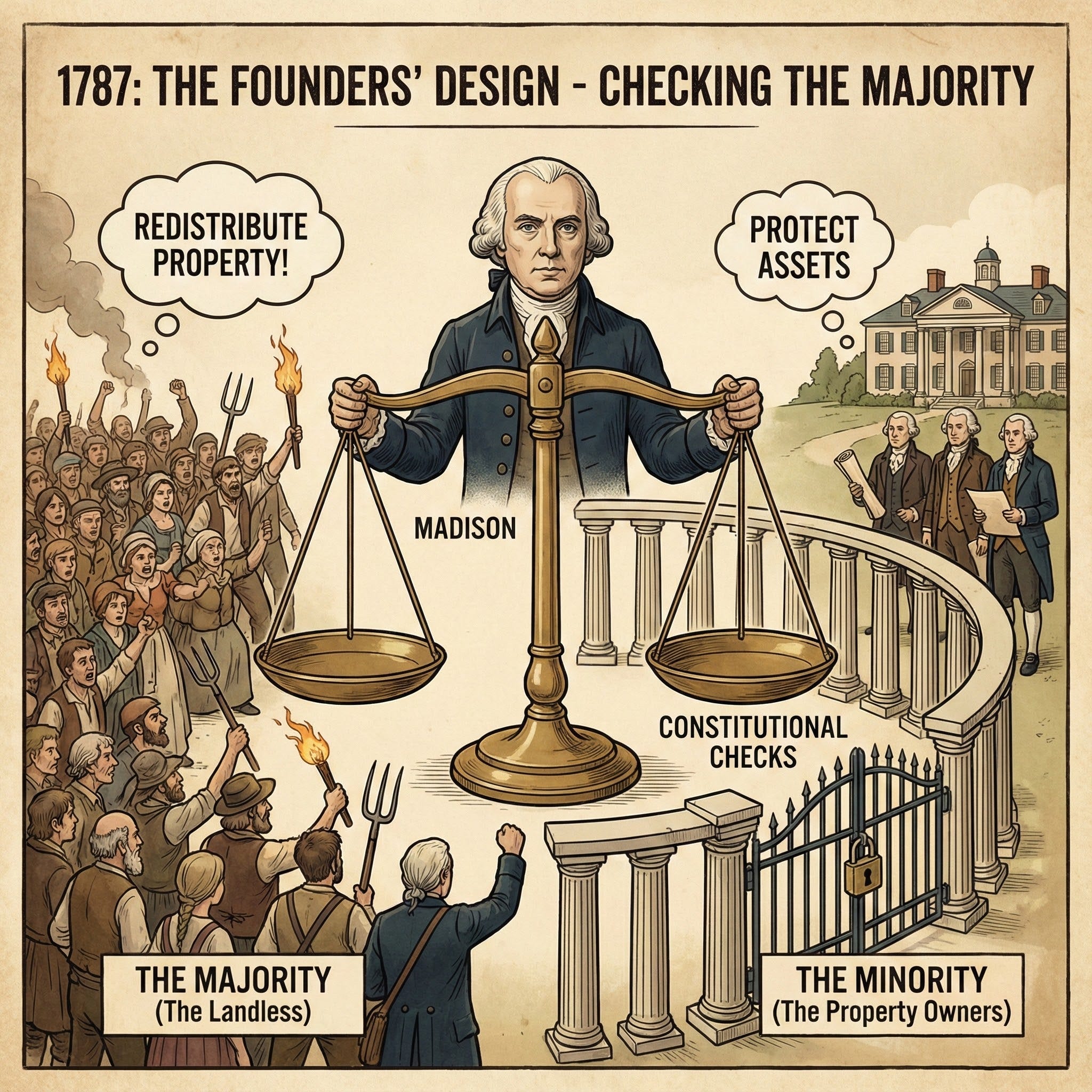 Madison’s fear was that if the "majority" — which in any society is composed of those with less property — gained full control of the government, they would inevitably use that power to subvert the interests of the wealthy minority.